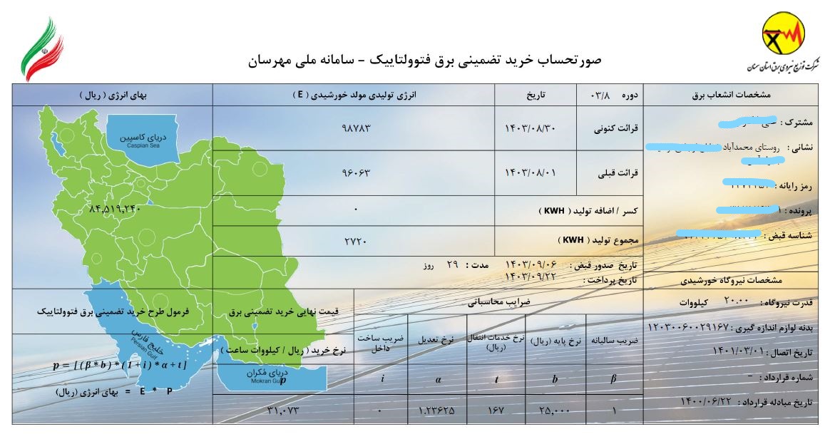 (نمونه صورتحساب خرید تضمینی برق فتوولتاییک سرمایه گذار 20 کیلووات )